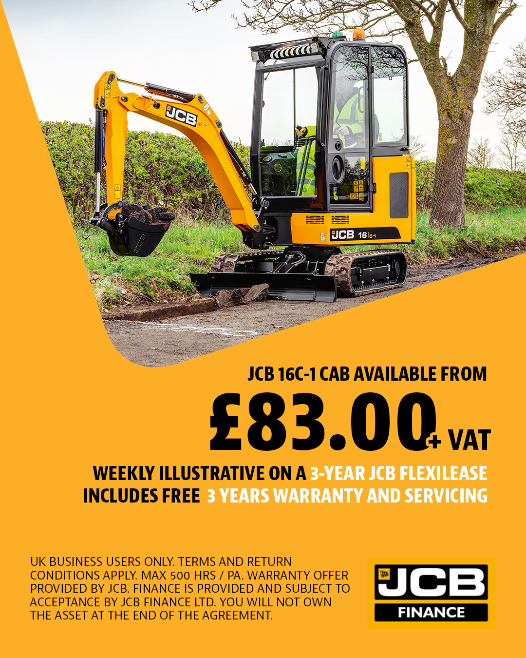JCB 16C-1 cab mini excavator from £83.00+VAT weekly illustrative on a 3-year JCB FlexiLease.