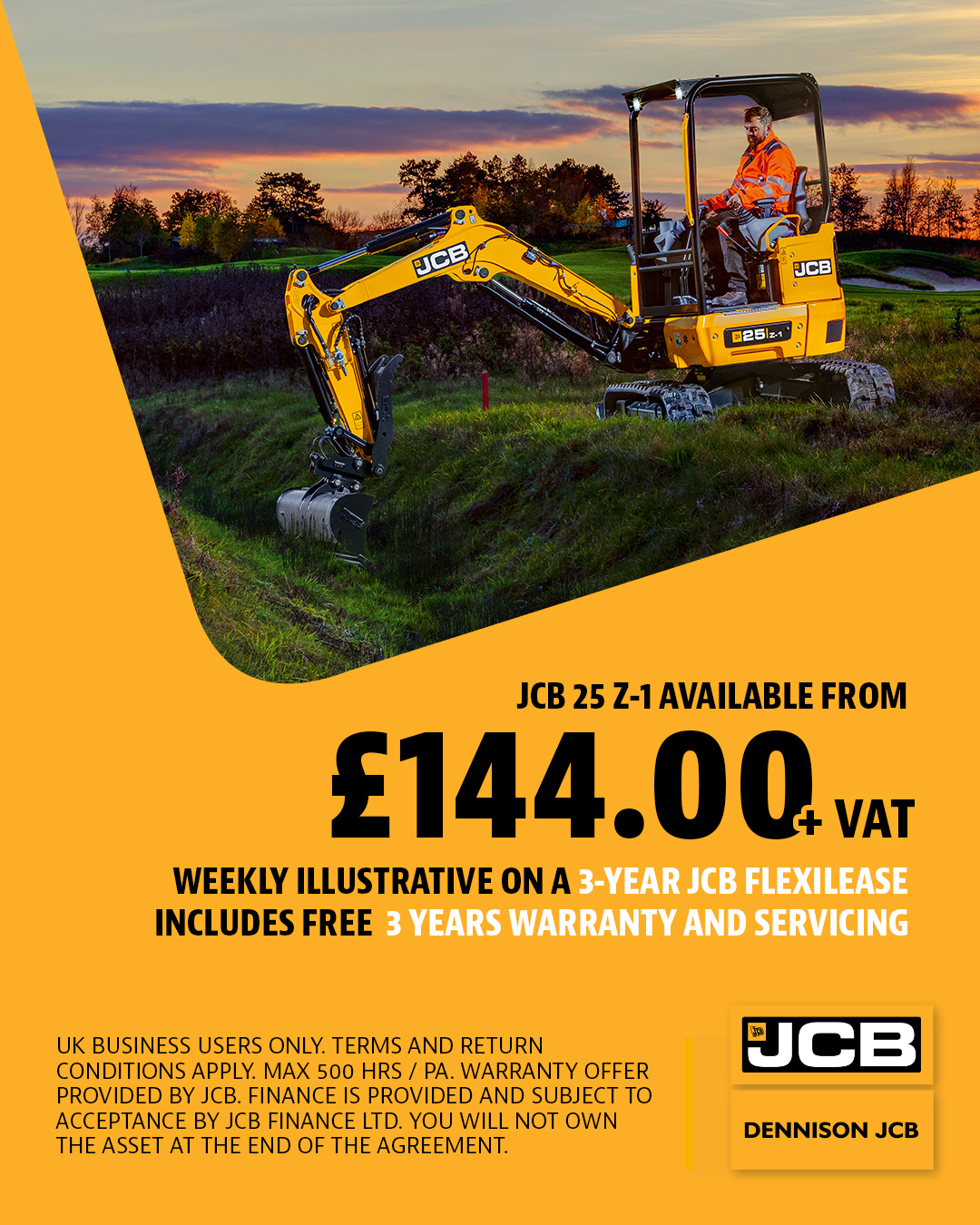 Dennison JCB (Registered Company No: NI022095) Registered office: 8 Ballyhartfield Road, Templepatrick, County Antrim, BT39 0RB) are registered by the Financial Conduct Authority as a credit broker, not a lender. Finance provided and subject to acceptance by JCB Finance Ltd, who are registered with the Financial Conduct Authority as a lender. Subject to your consent, we recieve a commission from JCB Finance Ltd which is a flat fee plus basic rate tax and employer National Insurance contributions for each JCB and/or non-JCB machine on the finance agreement. These payments are not additional fees that you will have to pay and is not added to the amount you pay under your finance agreement. UK business users only. Terms apply.